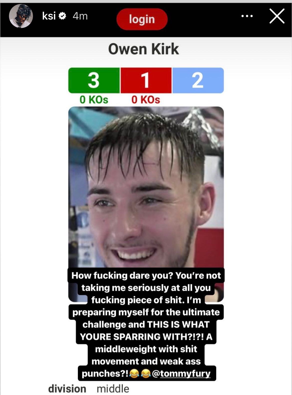Posting on his Instagram story KSI highlighted that Fury’s sparring partner is Owen Kirk who has a record of 3 wins, 2 draws, and 1 defeat.