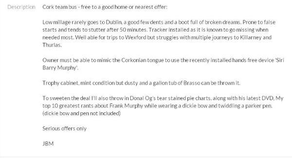 And now some smart alec has decided to twist the knife that bit more – by posting a highly sarcastic ad for the county’s ‘team bus’ on Done Deal.