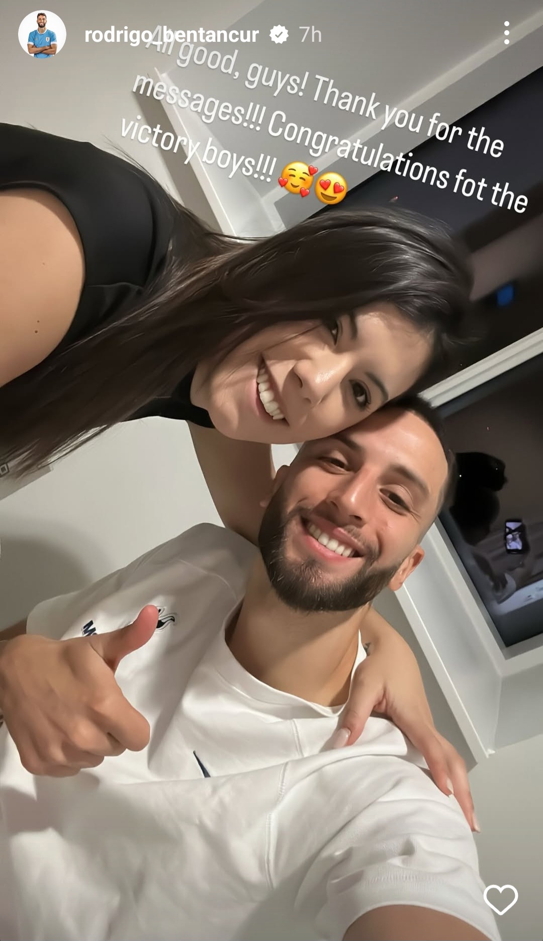 In what appears to be a positive update the Spurs star posted on Instagram a picture of himself alongside his partner Melany La Banca with the message: ‘All good, guys! Thank you for the messages!!! Congratulations for the victory boys!!!’