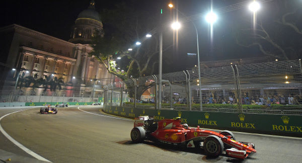 With Vettel comfortable at the front, Formula One’s only night race was turning into a rather processional affair. But that changed on lap 16 when the safety car was deployed after Nico Hulkenberg and Felipe Massa collided at turn one.