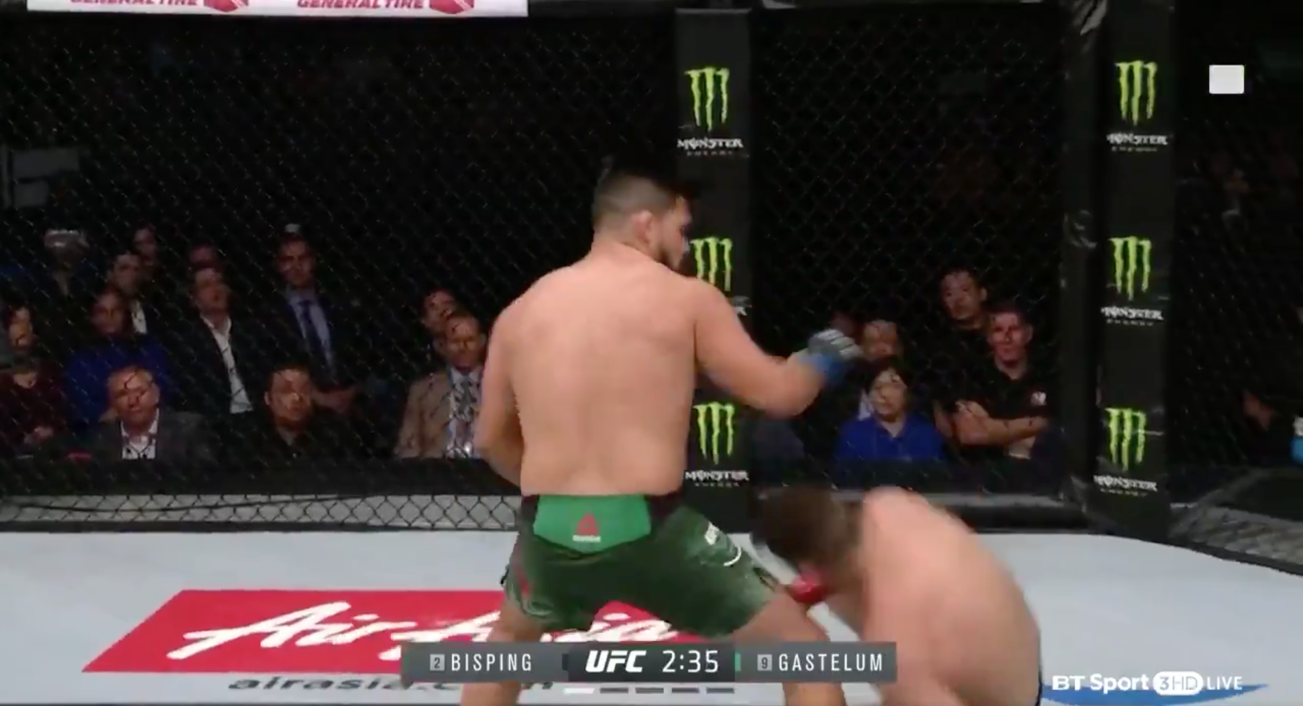 What a combo from Kelvin, you can see the exact moment that his left hook connects Bisping is knocked out.